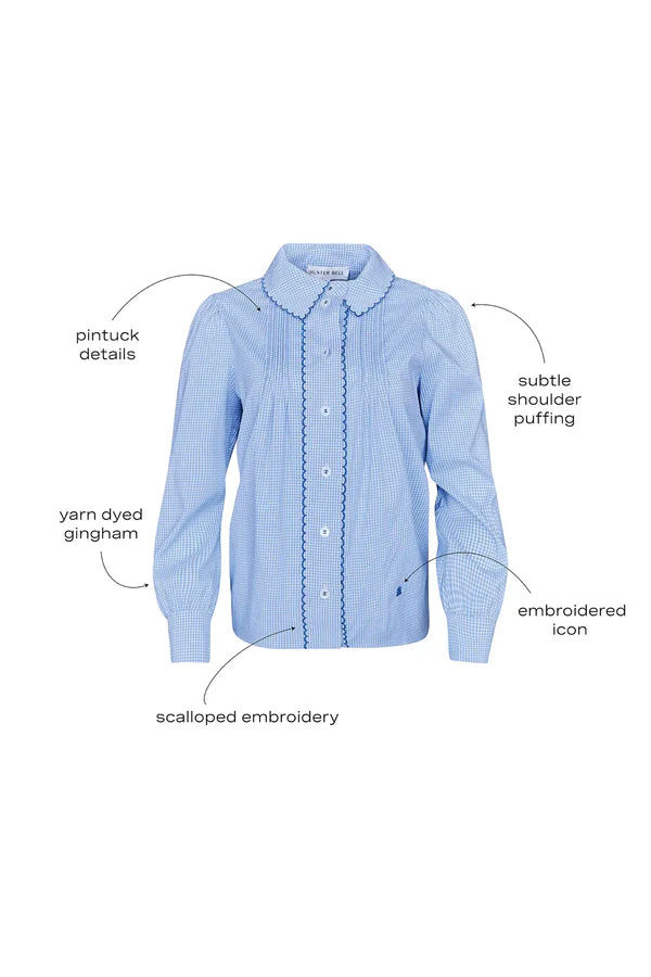 Meet the James Shirt in Saltwater Check—a contemporary take on the classic button-down with a refined, feminine twist. Cut in stretch, yarn-dyed gingham, it features a crisp collar, a clean button-front placket, and long sleeves with button cuffs. Subtle shoulder puffing and delicate pintuck details sculpt the silhouette with quiet precision, adding just the right dose of sophisticated polish. Effortless to style, unmistakably elevated.