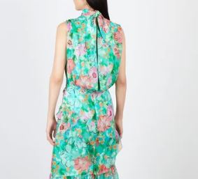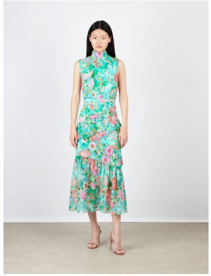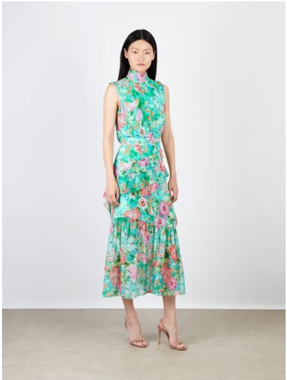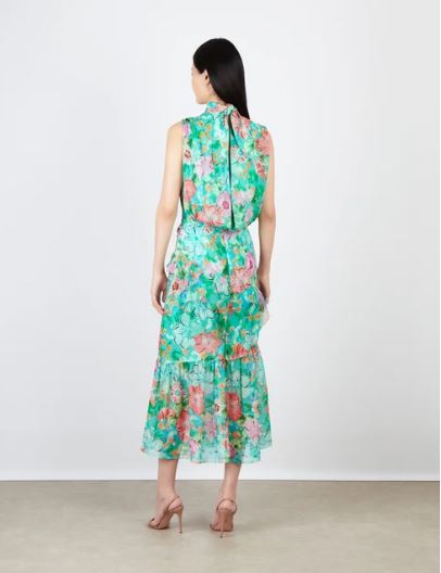 The Fleur Ruffle Dress is an effortlessly romantic silhouette designed to move beautifully with every step. Crafted in luxurious silk chiffon and rendered in a vibrant floral print, the dress features a softly gathered neckline with delicate ties that fasten elegantly at the back.