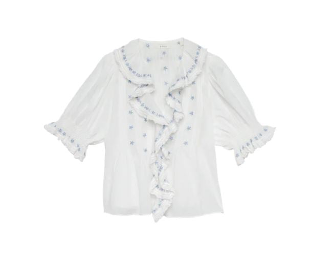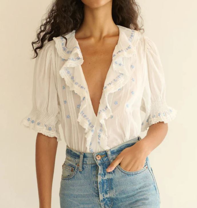 Hand-embroidered daisies and clustered pintucks lend texture to the yoke, back, and short puffed sleeves. A line of hidden starburst buttons extend down the center front. Wear it loose, or tuck it into your favorite high-waisted jeans.