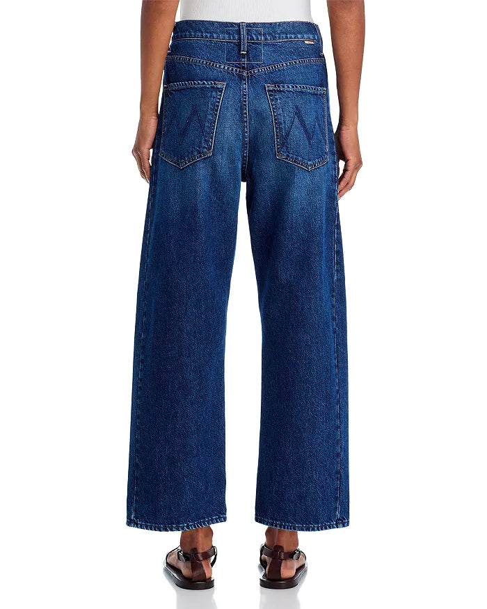 High hopes. A super high-waisted jean with a wide, curved leg, an ankle-length inseam and a clean hem. Made from SUPERIOR denim, Did You Bring Me Anything? is a dark blue wash with whiskering and fading at the knees.